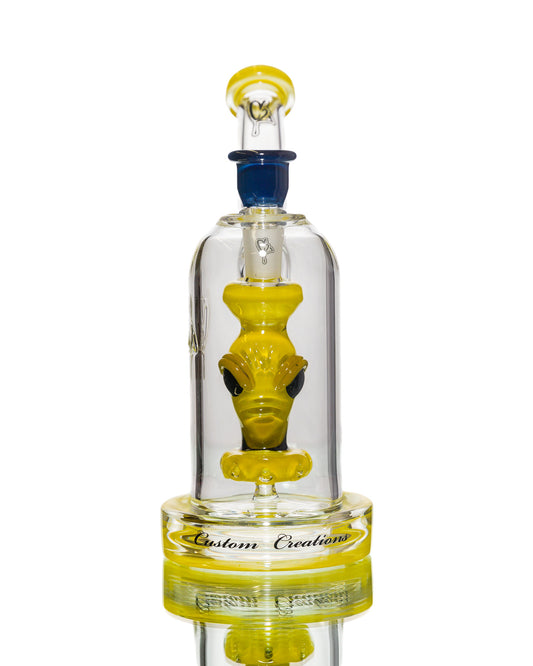 Design Details: The Aaron B Water Pipe in Green & Purple features vibrant green, purple, and yellow patterns that make this piece a striking addition to any collection. It includes a matching bowl head, enhancing both the functionality and aesthetic of the water pipe.
