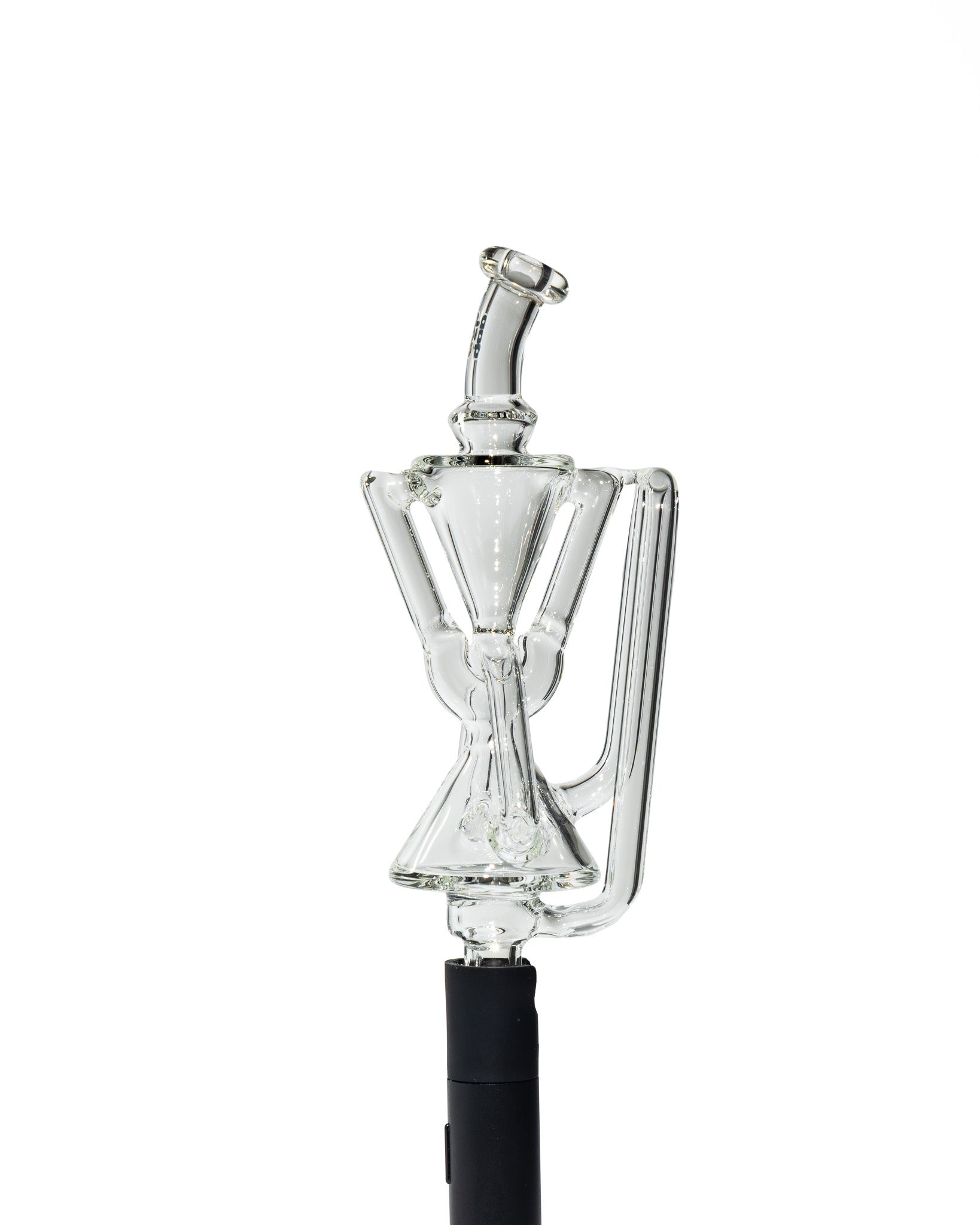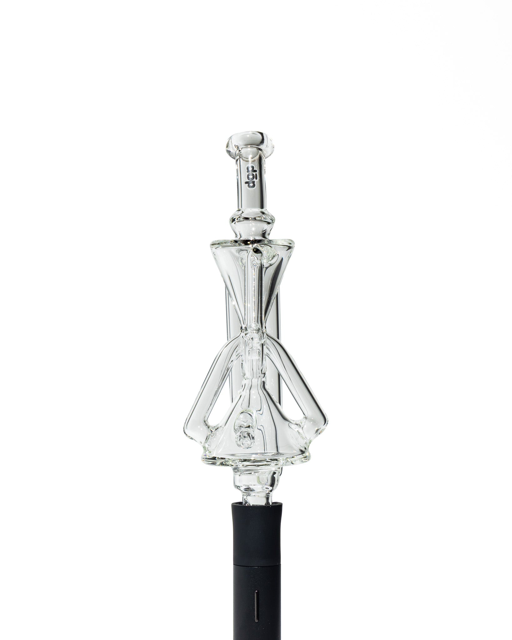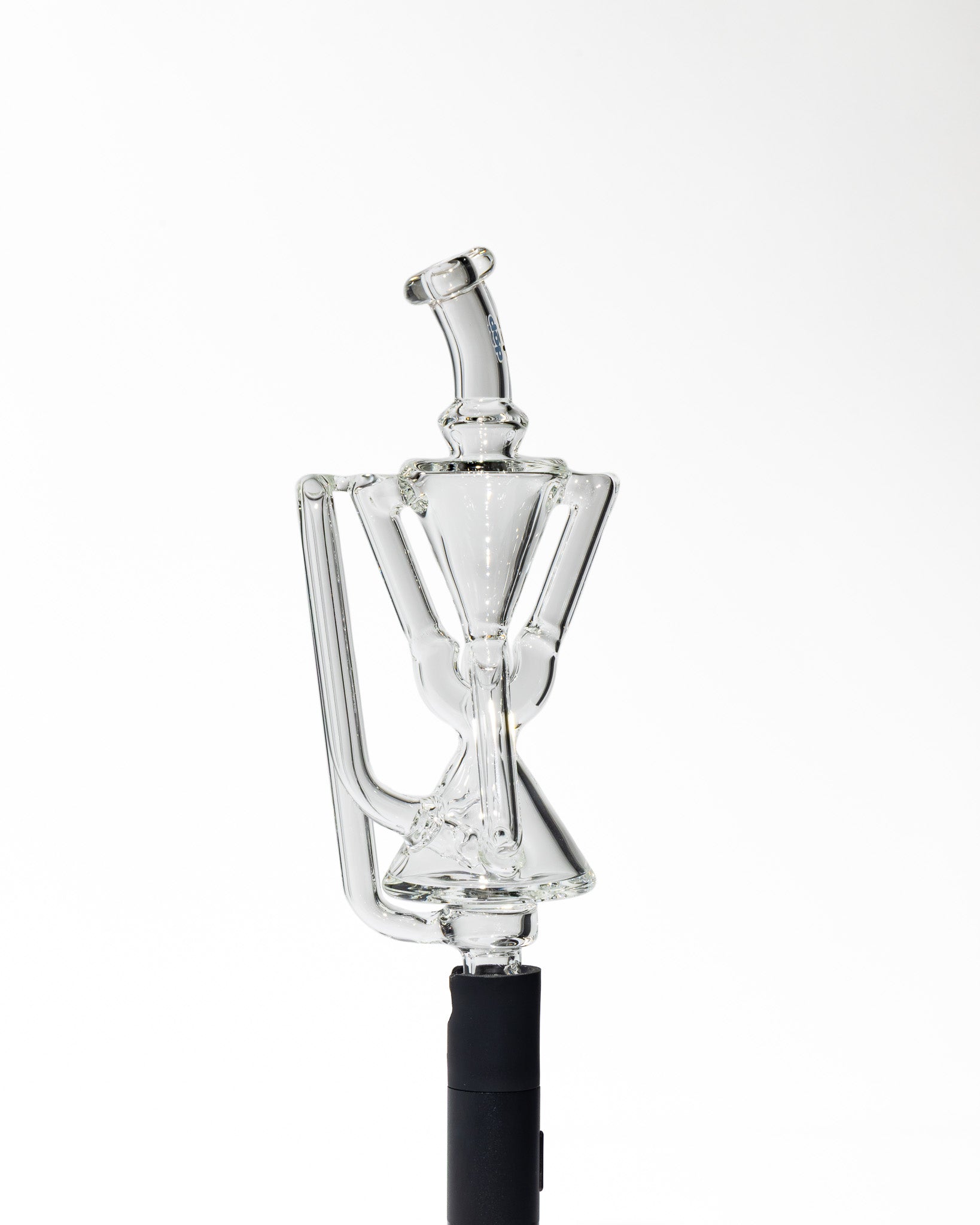 Design Details: Crafted with the same heady geometry as its Peak Pro big brother, this Pivot replacement glass features a compact double uptake recycler housed in a sleek, clear body. The sharp hourglass shaping, flared mouthpiece, and elongated drain arm give it a sculptural silhouette that stands out from standard Pivot glass.