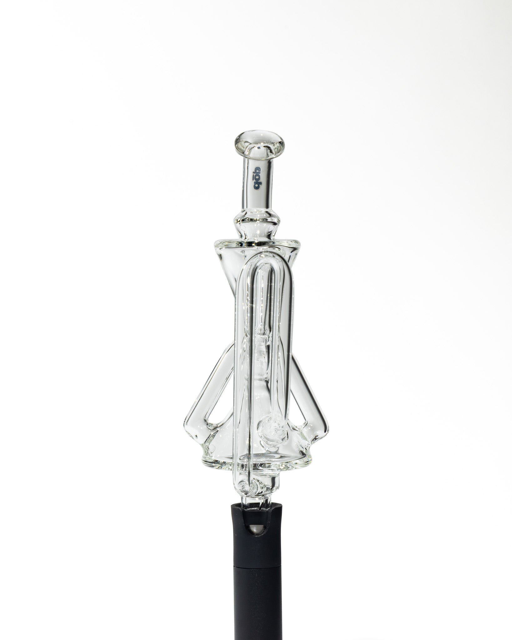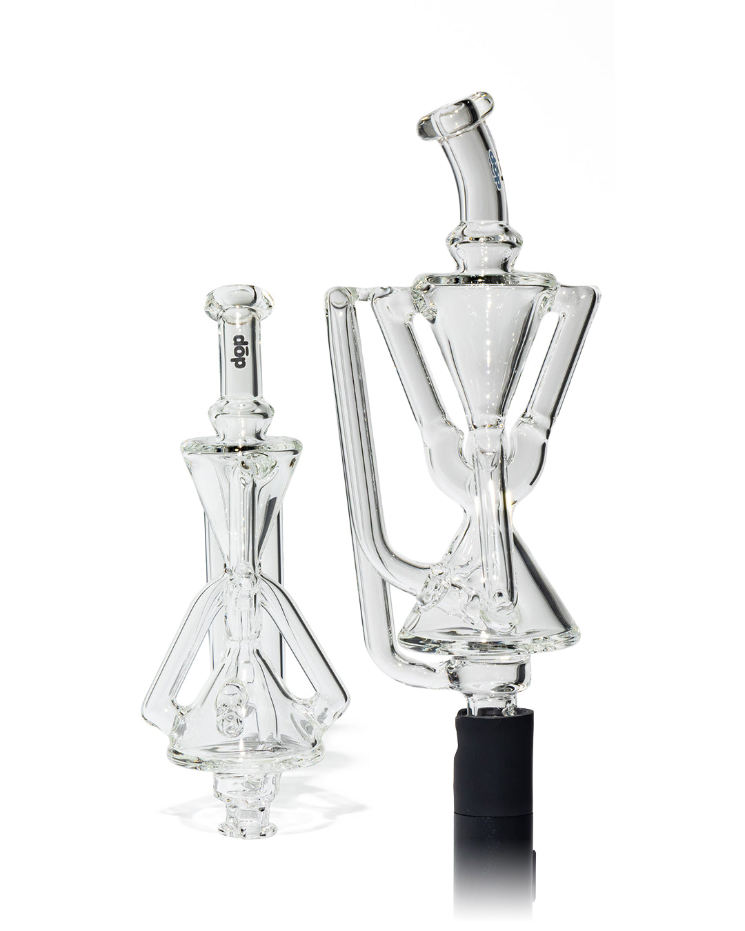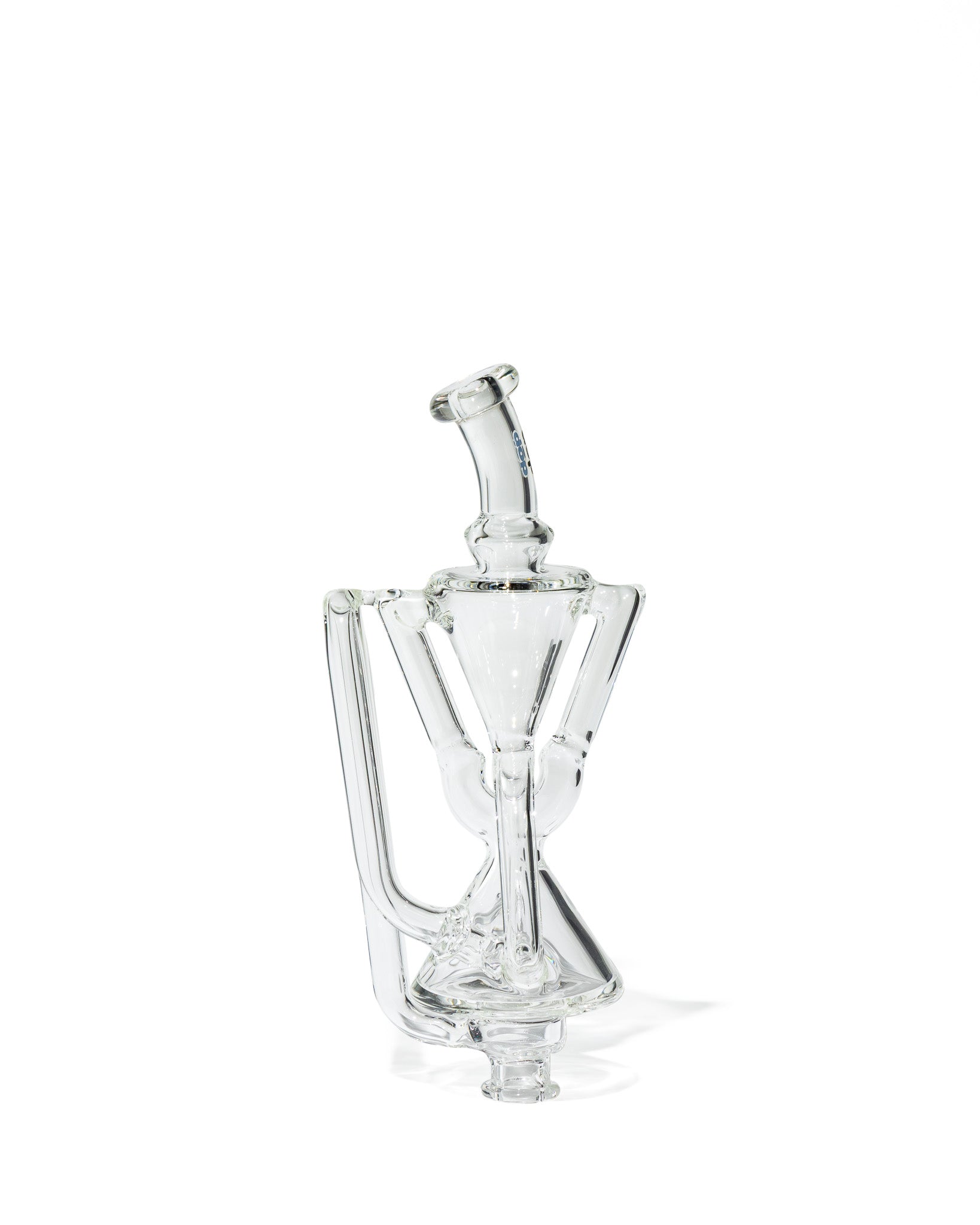 Design Details: Crafted with the same heady geometry as its Peak Pro big brother, this Pivot replacement glass features a compact double uptake recycler housed in a sleek, clear body. The sharp hourglass shaping, flared mouthpiece, and elongated drain arm give it a sculptural silhouette that stands out from standard Pivot glass.